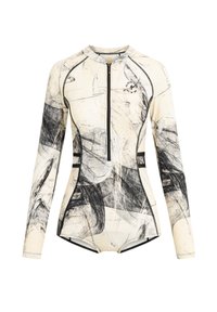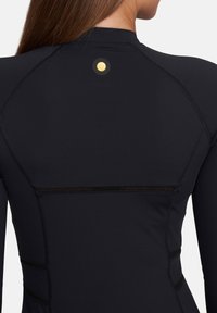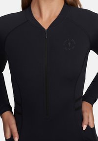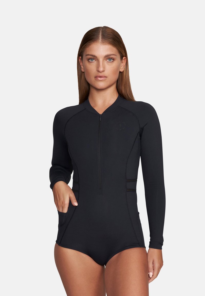 Kobieta ubrana w czarny, długi kombinezon do nurkowania z przednim zamkiem, stojąca z jedną ręką w kieszeni kombinezonu na jednolitym tle.