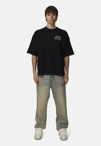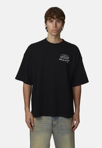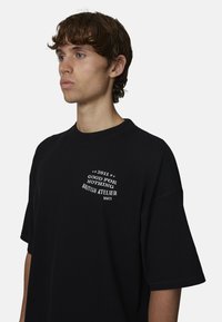 Mężczyzna z krótkimi brązowymi włosami, ubrany w czarny, oversize'owy T-shirt z białym napisem „2011 Good For Nothing British Atelier MMXI” na plecach.