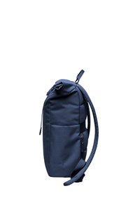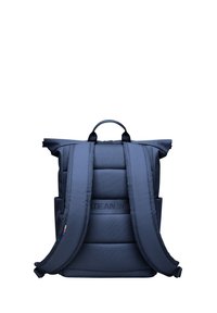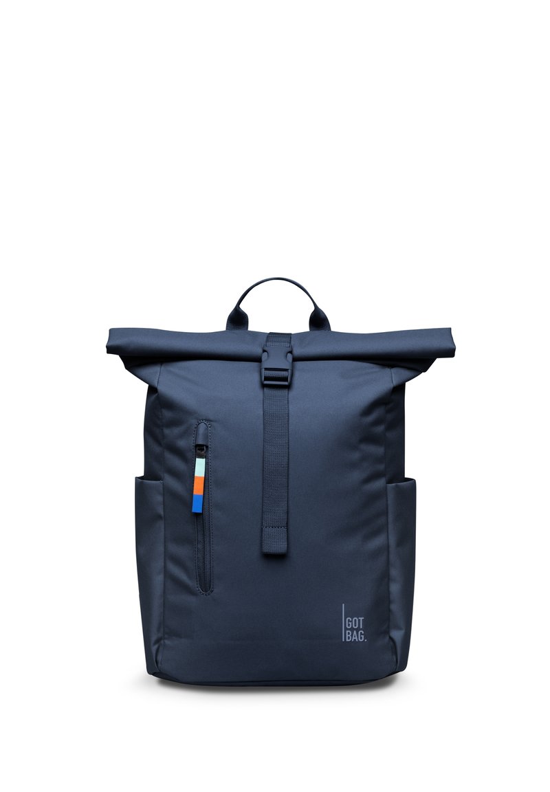 Granatowy plecak z rolowaną górą, zapinany na zamek z przodu, z bocznymi kieszeniami, górnym uchwytem oraz logo "GOT BAG" w dolnym prawym rogu.