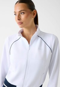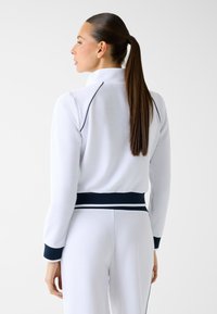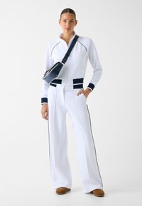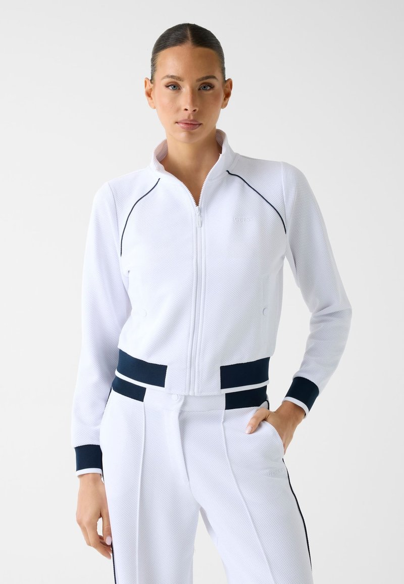 Kobieta o ciemnych włosach, ubrana w biały rozpinany na zamek kurtkę i pasujące białe spodnie z czarną lamówką, stojąca na jednolitym jasnym tle.