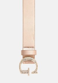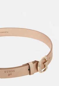 Beżowy skórzany pasek z dużą złotą klamrą w kształcie litery "G", ozdobioną przezroczystymi cyrkoniami, na białym tle.