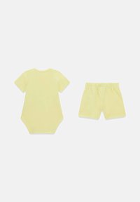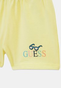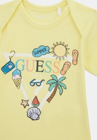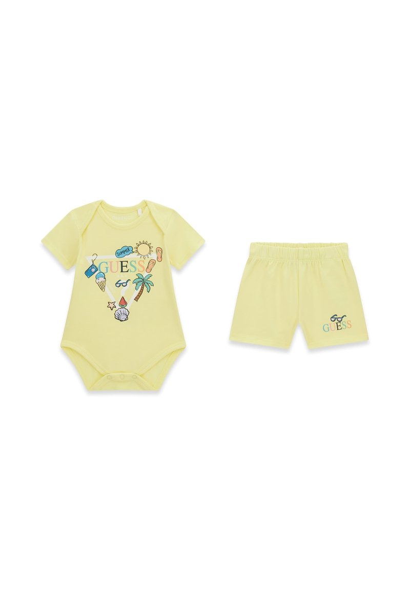 Żółty dziecięcy body i dopasowane spodenki z letnimi motywami graficznymi, w tym słońce, lody, palma i napis "GUESS".