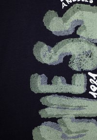 Granatowy t-shirt z krótkim rękawem z teksturowanym zielonym i szarym napisem "GUESS" oraz białymi nadrukami "Los Angeles" i "1981" na przodzie.