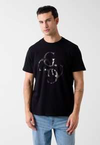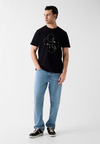 Czarny bawełniany t-shirt z połyskującym srebrnym logo graficznym. Koszulka ma klasyczny okrągły dekolt i krótkie rękawy. Pasuje do jasnoniebieskich dżinsów.