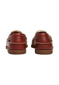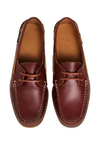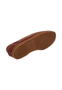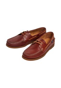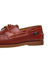 Brązowy skórzany but żeglarski z przeszyciami, gumową podeszwą, sznurowanymi akcentami i boczną metką z nazwą marki. Niski profil i gładka faktura.