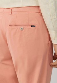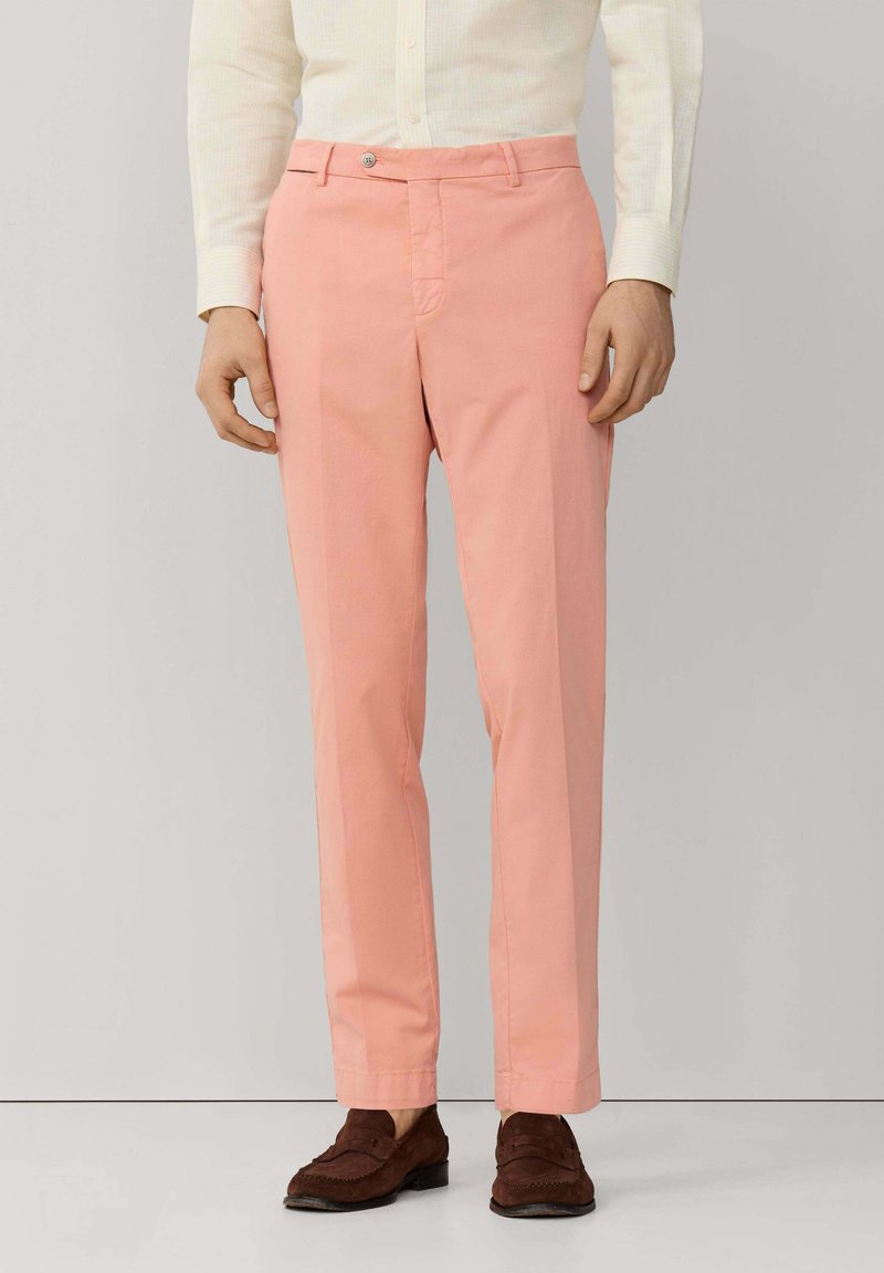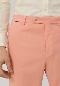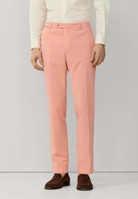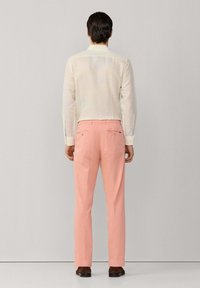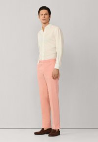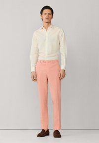 Mężczyzna ubrany w proste, łososioworóżowe spodnie, białą koszulę na długi rękaw zapinaną na guziki oraz ciemnobrązowe mokasyny z zamszu, stojący na tle jednolitego tła.