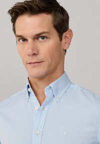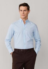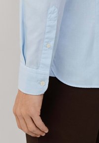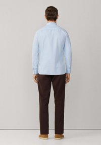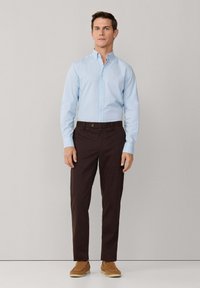 Mężczyzna w jasnoniebieskiej koszuli na guziki i ciemnobrązowych spodniach, stojący z rękami w kieszeniach na jednolitym tle.