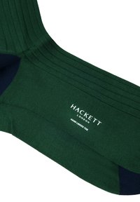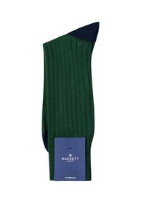 Para ciemnozielonych prążkowanych skarpetek z granatowymi sekcjami na palcach i piętach, ułożonych płasko i częściowo nachodzących na siebie na białym tle.