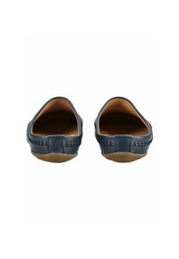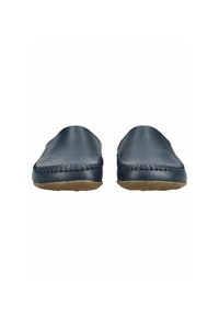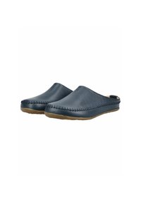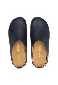 Granatowy, skórzany klapek na obcasie typu mule z teksturowaną cholewką, przeszyciami i jasnobrązową podeszwą, pokazany z boku na białym tle.