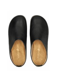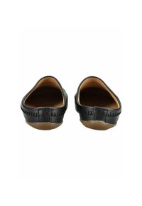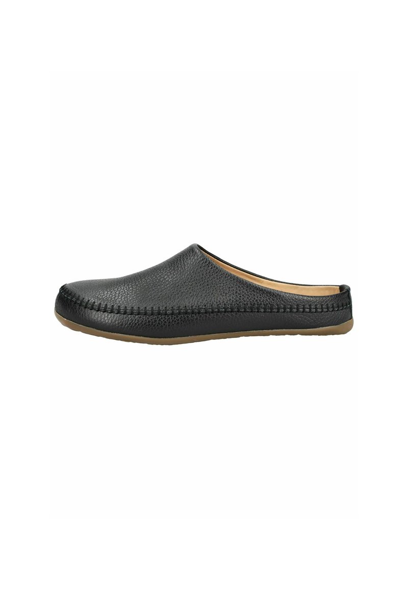 Czarne skórzane mules na wsuwkę z detalami przeszyć i brązową gumową podeszwą, zaprojektowane do codziennego noszenia w pomieszczeniach i na zewnątrz.