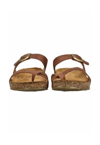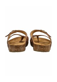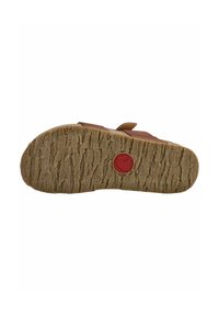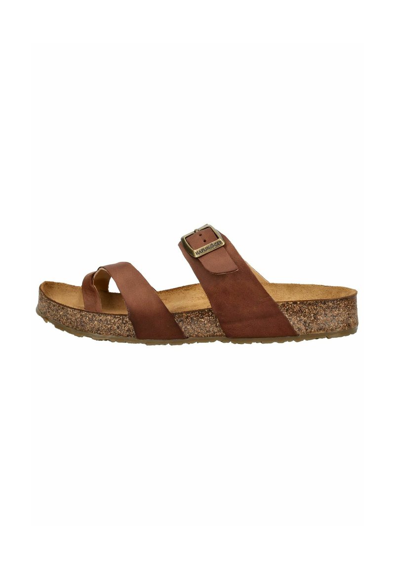 Brązowy skórzany sandał z odkrytymi palcami, korkową wkładką, dwoma paskami na stopie oraz regulowaną metalową klamrą na górnym pasku.