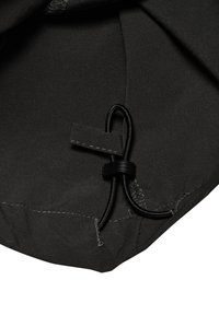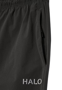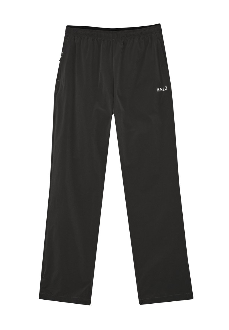 Czarne lekkie spodnie dresowe z elastycznym pasem i logo "HALO" na prawej udzie, pokazane na płasko na białym tle.