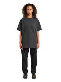 Czarny, oversize, krótki rękaw T-shirt z okrągłym dekoltem, wykonany z bawełny, z delikatną metką logo blisko brzegu i gładką fakturą.