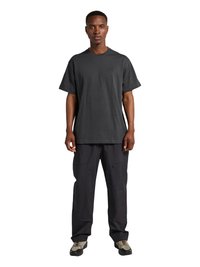 Mężczyzna stojący przodem, ubrany w ciemny, luźny T-shirt, luźne czarne spodnie oraz beżowo-czarne trampki na białym tle.