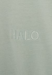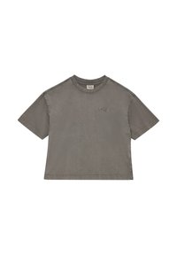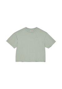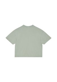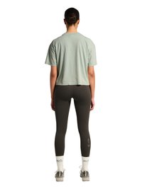 Kobieta stoi zwrócona przodem, ubrana w jasnokrótki zielony oversize t-shirt, czarne legginsy, białe skarpetki i szare trampki na białym tle.