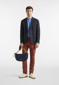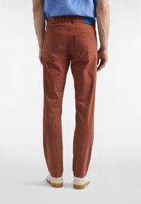 Spodnie w kolorze rdzy o wąskim kroju, wykonane z bawełny, z klasycznym pięciokieszeniowym wzorem, subtelnymi detalami przeszyć i zapięciem na guzik.