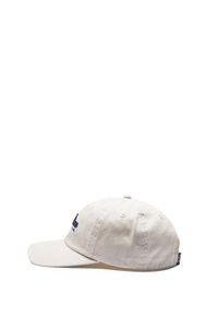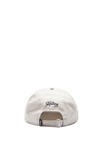 Jasnobeżowa czapka z daszkiem z zaokrąglonym rondem i czarnym haftowanym logo "Hatline LAB." na przednim panelu.