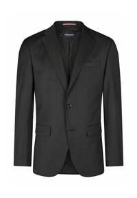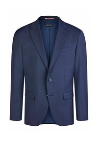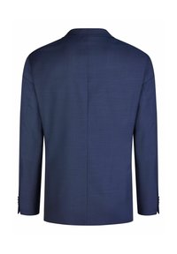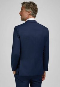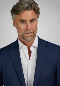 Mężczyzna z siwymi włosami i brodą poprawiający granatową marynarkę garnituru na białej koszuli, na jednolitym tle.