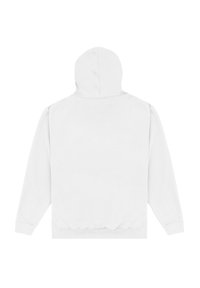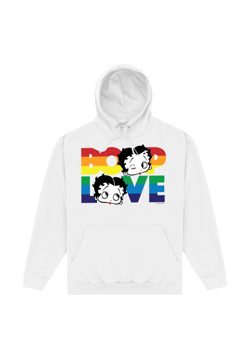 Biała bluza z kapturem z graficznym wzorem przedstawiającym dwie rysunkowe twarze oraz napisem "BOOP LOVE" w tęczowych kolorach, podkreślająca zabawny styl.