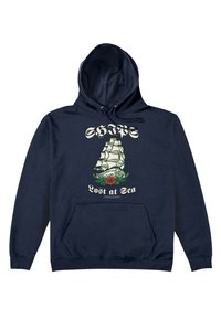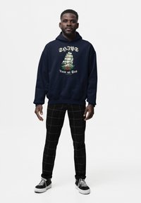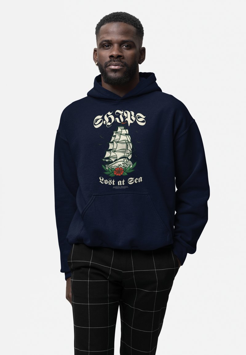 Mężczyzna ubrany w granatową bluzę z kapturem z nadrukiem żaglowca oraz napisem „SHIP Lost at Sea”, w połączeniu z czarnymi spodniami w biały wzór w kratę okienną.