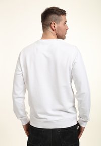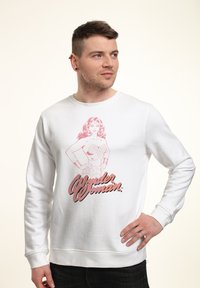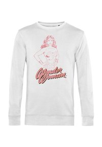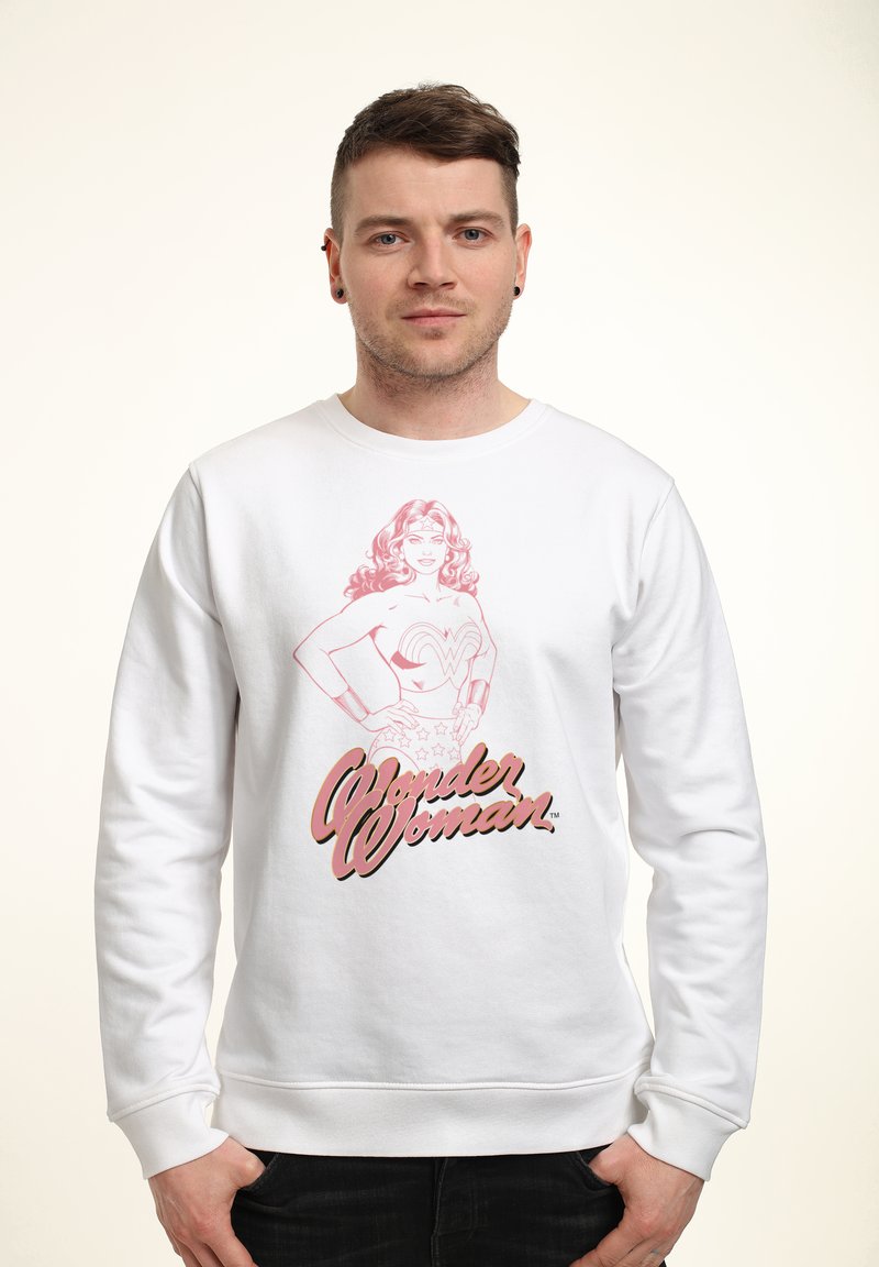 Biała bluza z różową grafiką Wonder Woman i jej imieniem napisanym dużymi literami poniżej. Luźny krój, okrągły dekolt, ściągacze przy rękawach.