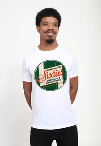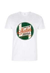 Mężczyzna uśmiechający się, ubrany w białą koszulkę z zielonym kołem i pomarańczowym napisem "Born in the Sixties Original & Unrestored", stojący na białym tle.