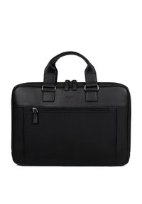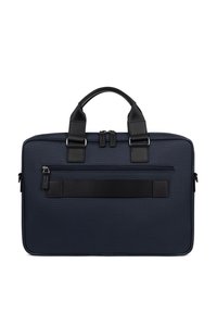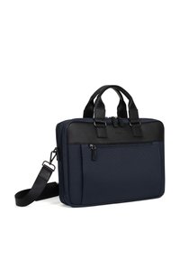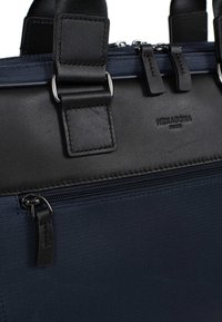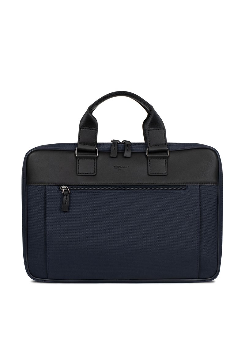 Prostokątna teczka w kolorze granatowym i czarnym z podwójnymi uchwytami, przednią kieszenią na zamek i podwójnym zamknięciem zamka u góry.
