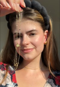 Ten zestaw złotych chokerów zawiera dwa oddzielne naszyjniki zaprojektowane do noszenia razem lub osobno. Jeden to prosty, elegancki płaski łańcuszek, a drugi wykonany jest z drobnych ogniw z siedmioma delikatnymi koralikami rozmieszczonymi równomiernie wokół naszyjnika. Oba chokery zapinają się na karabińczyk z tyłu i zawierają regulowane przedłużenie dla wygodnego, indywidualnego dopasowania. Mierzący 33 cm z dodatkowym przedłużeniem 8 cm, zestaw ten dodaje miejskiego, ale jednocześnie glamourowego akcentu do codziennych koszulek, przetartych jeansów lub sukienek.