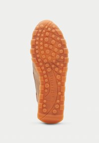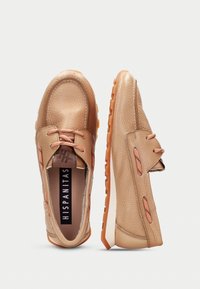 Beżowy wsuwany mokasyn z teksturowanej skóry, z przeszyciami w stylu moc toe, dekoracyjnymi bocznymi sznurowadłami oraz gumową podeszwą z bieżnikiem.