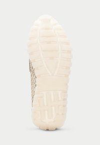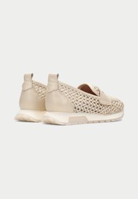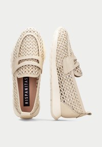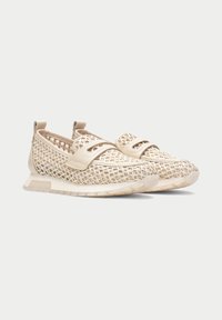 Beżowy but wsuwany z wierzchem z tkanej siateczki, z teksturowanym paskiem, wzmocnionym obcasem oraz białą gumową podeszwą z wzorem bieżnika.