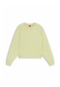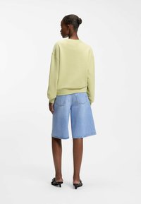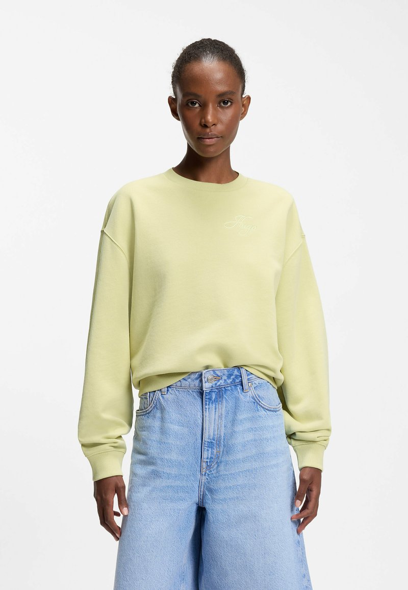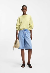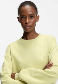 Kobieta w jasnożółtej bluzie z małym białym logo na piersi i jasnoniebieskich, szerokich spodniach o wysokim stanie, stojąca na białym tle.