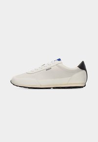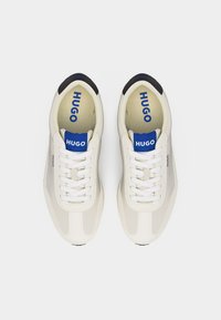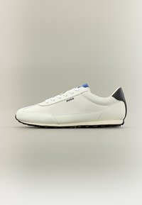 Biały niski sneaker z czarnym obcasem, niebieskim detalem na języku, białymi sznurowadłami i logo „HUGO” po boku, widoczny z profilu.