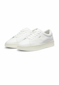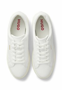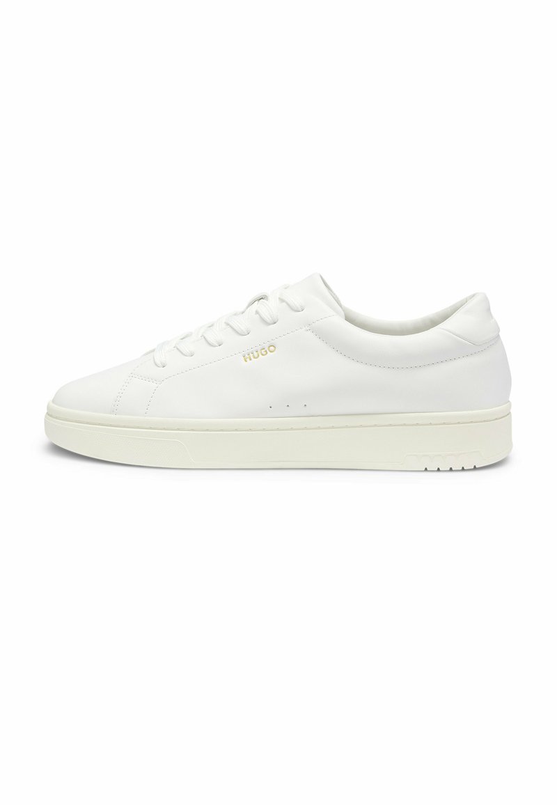 Biała skórzana niska tenisówka z kremową podeszwą, sznurowanym przodem i małym złotym logo „HUGO” po boku.