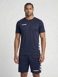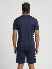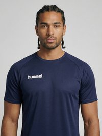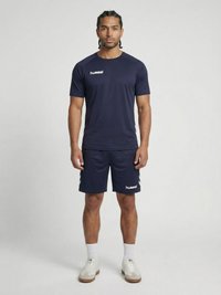 Mężczyzna z warkoczami, ubrany w granatowy strój sportowy hummel, stoi na jasnym, jednolitym tle, ramiona luźno opuszczone wzdłuż ciała.