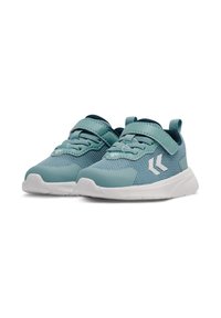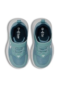 Turkusowy meshowy sneaker z białą podeszwą, z paskiem na rzep i ozdobnym białym logo, zaprojektowany z myślą o komforcie i wsparciu.