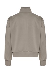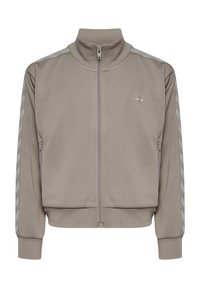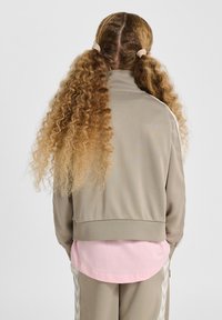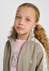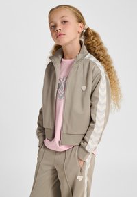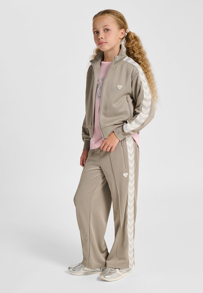 Beżowy dres z bluzą na zamek z paskami w kształcie litery V i dopasowanymi spodniami. W zestawie jasnoróżowa koszulka i srebrne sneakersy.