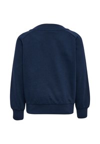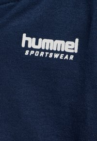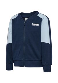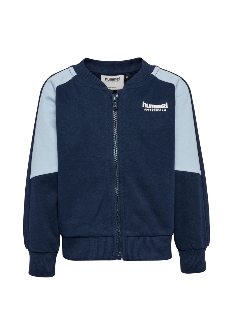 Granatowa kurtka na zamek z jasnoniebieskimi panelami, ściągaczami na mankietach i u dołu. Na górnej lewej stronie znajduje się biały znak "hummel". Miękki materiał.