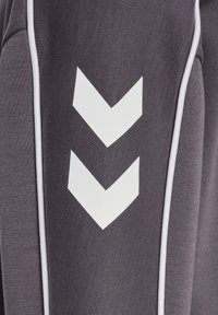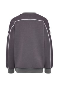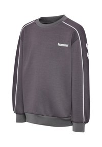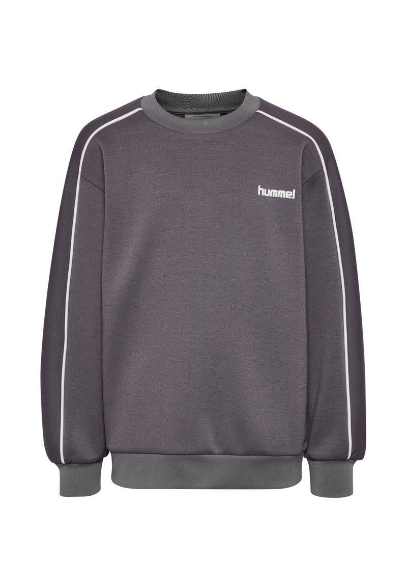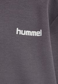 Szara bluza z miękkiej tkaniny, z okrągłym dekoltem, białymi akcentami wzdłuż ramion oraz logo „hummel” na piersi.