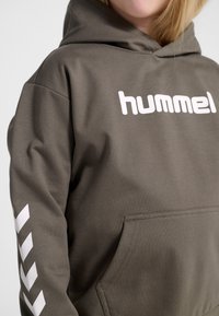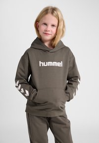 Dziecko w oliwkowo-zielonej bluzie z kapturem i spodniach marki Hummel, białe trampki, stoi z rękami w kieszeniach na jednolitym tle.