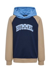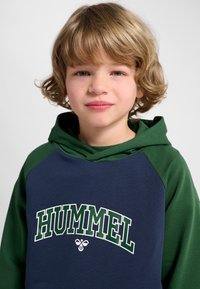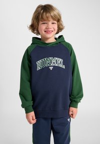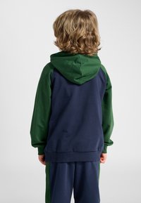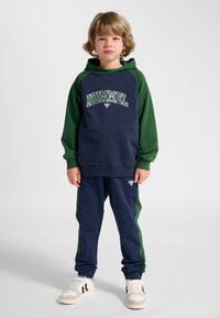 Dziecko z kręconymi blond włosami stoi zwrócone przodem, ubrane w granatowo-zieloną sportową bluzę z kapturem Hummel oraz pasujące spodnie i białe trampki.