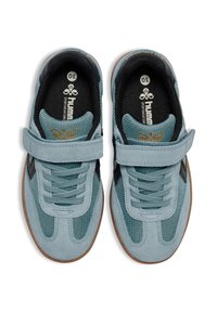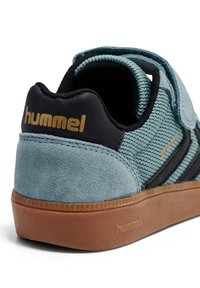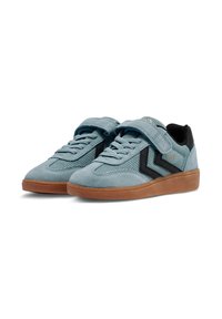 Niebieski tenisówka zamszowa i siateczkowa z czarnymi akcentami, zapinana na rzep, z gumową podeszwą. Posiada logo na pięcie oraz teksturowane detale.