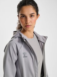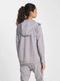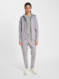 Kobieta z ciemnymi włosami związanymi do tyłu, ubrana w jasnoszarą bluzę z kapturem na zamek i dopasowane spodnie dresowe, patrzy lekko w lewo.