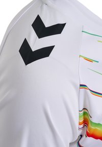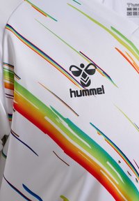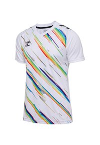 Biały, sportowy T-shirt z krótkim rękawem, ozdobiony kolorowymi ukośnymi smugami w kolorach czerwonym, niebieskim, zielonym i żółtym, z czarnym logo na piersi.