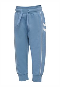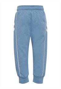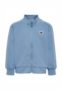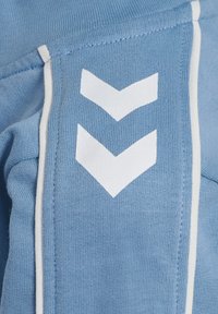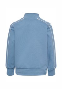 Jasnoniebieski dres wykonany z miękkiej tkaniny, składający się z kurtki zapinanej na zamek z kołnierzem stójką i białymi paskami po bokach, zestawiony z pasującymi spodniami.
