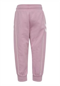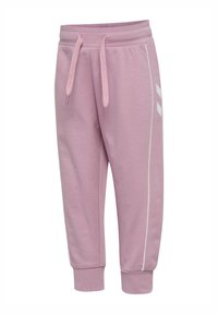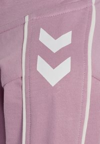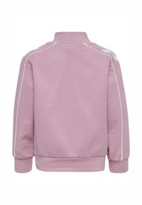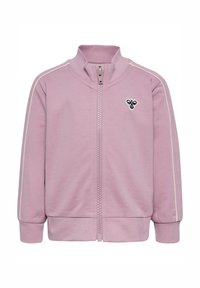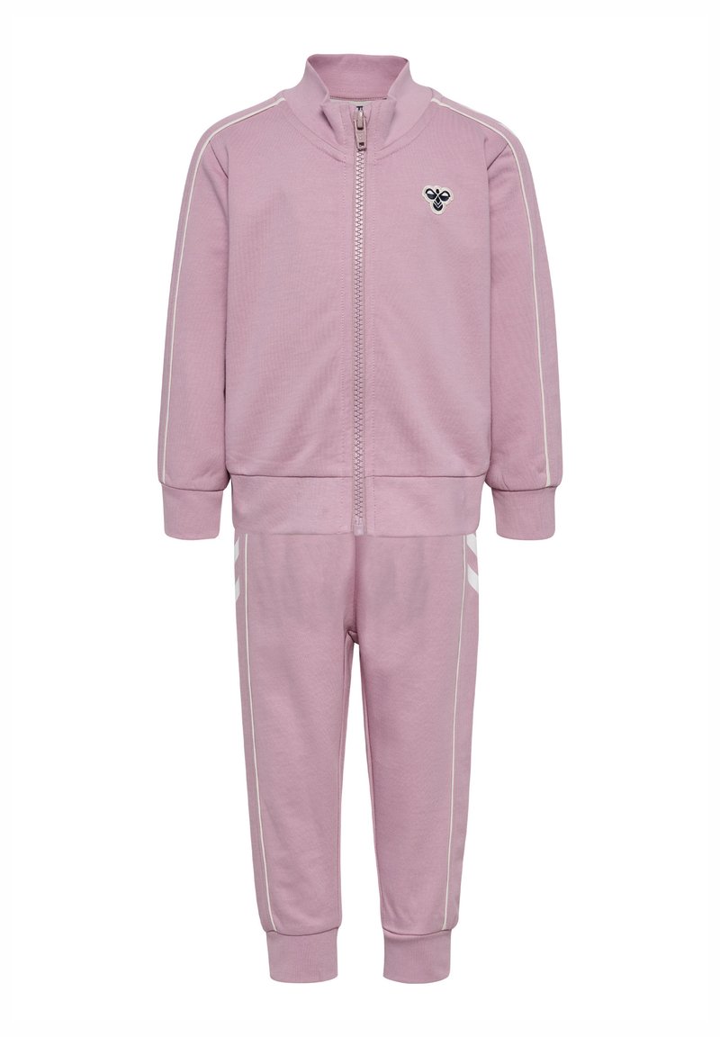 Jasnoróżowy dres z kurtką zapinaną na zamek i spodniami. Posiada białe paski jako akcenty i małe logo na piersi. Miękka faktura materiału.