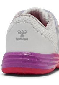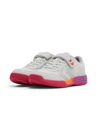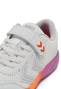 Biały siateczkowy sneaker z paskiem na rzep, szarym wzorem w jodełkę i gradientową podeszwą przechodzącą od czerwonego przez pomarańczowy do fioletowego.