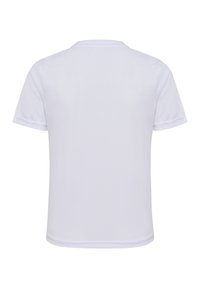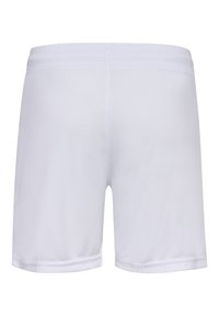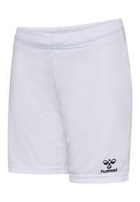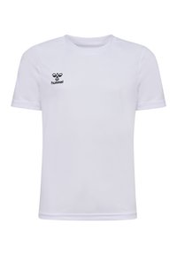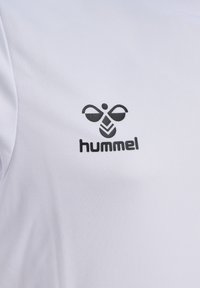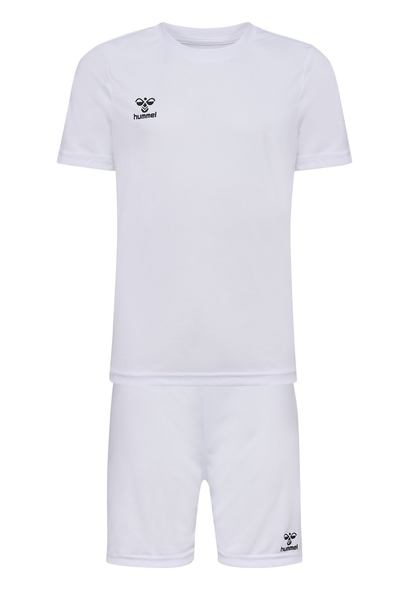 Biały sportowy zestaw z krótkim rękawem oraz spodenki z czarnym logo Hummel na piersi i na dole lewej nogawki spodenek.