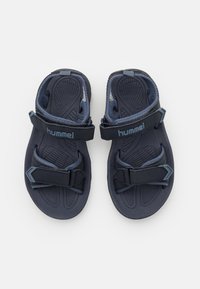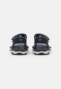 Ciemnoniebieskie sandały z regulowanymi paskami, teksturowaną wkładką i białą podeszwą zygzakowatą. Wykonane z materiału syntetycznego o lekkiej konstrukcji.