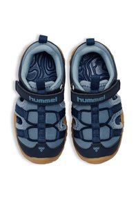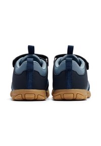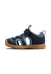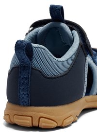 Granatowe sandały dziecięce z akcentami z siateczki, regulowanym paskiem, gumową podeszwą i strategicznymi wycięciami zapewniającymi wentylację.