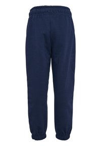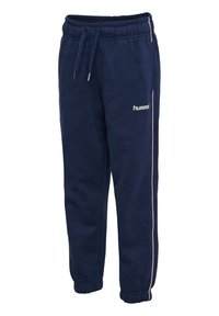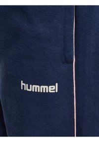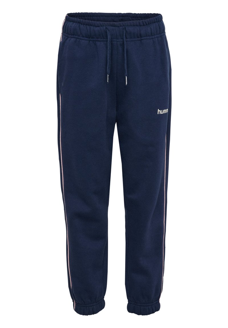 Granatowe dresy z elastycznym pasem i mankietami, sznurkiem do regulacji, bocznymi paskami oraz małym logo "hummel" na przedniej części uda.